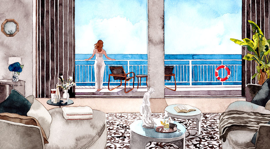 全室が海に面した広々とした客室。「CABIN TOWEL」は、クルーズライフにはかかせない「ROYAL-PHOENIX of the seas」のベーシックモデル。長いパイルと高密度の織りが、贅沢な時間にふさわしい柔らかさと充分な量感を実現しました。アンカーロープをイメージしたヘムのデザインには、今治の豊かさを象徴する自然のカラーリングが組み合わされています。
